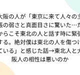 大阪の人が「東京に来て人々の主張の弱さと真面目さに驚いた…だからこそ東北の人と話す時に緊張する。絶対僕は東北の人を傷つけている」と感じた話→東北人と大阪人の相性は悪いのか
