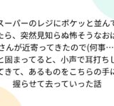 スーパーのレジにボケッと並んでたら、突然見知らぬ怖そうなおばさんが近寄ってきたので(何事…)と固まってると、小声で耳打ちしてきて、あるものをこちらの手に握らせて去っていった話