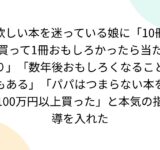 欲しい本を迷っている娘に「10冊買って1冊おもしろかったら当たり」「数年後おもしろくなることもある」「パパはつまらない本を100万円以上買った」と本気の指導を入れた
