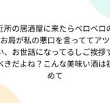 近所の居酒屋に来たらベロベロのお局が私の悪口を言っててアツい、お世話になってるしご挨拶すべきだよね?こんな美味い酒は初めて