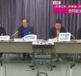 JR東日本・JR東海・JR西日本・JR九州による合同記者会見、Tシャツの色を各社の企業カラーにしているので戦隊モノとかゲームとかゴチの並びに見える