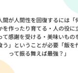 人間が人間性を回復するには「何かを作ったり育てる・人の役に立って感謝を受ける・美味いものを食う」ということが必要「飯を作って振る舞えば最強?」