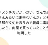 「メンチカツが小さい。なんで母さんみたいに出来ないんだ」と元旦那が文句を言うので義母に電話したら、肉屋で買っていたことが判明した