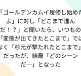 「ゴールデンカムイ履修し始めたよ」に対し「どこまで進んだ!?」と聞いたら、いつもの「変態が出てきたとこまで」ではなく「杉元が撃たれたとこまで」だったが、結局「どのシーンだ…」となった