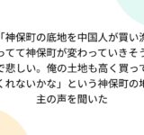 「神保町の底地を中国人が買い漁ってて神保町が変わっていきそうで悲しい。俺の土地も高く買ってくれないかな」という神保町の地主の声を聞いた