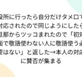 役所に行ったら自分だけタメ口で対応されたので同じようにしたら旦那からツッコまれたので「初対面で敬語使わない人に敬語使う必要はない」と返した→本人の対応に賛否が集まる