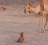 子犬がはるかに大きいラクダに歩み寄って友達になろうとする…かわいらしい2匹の交流