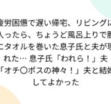 疲労困憊で遅い帰宅、リビングに入ったら、ちょうど風呂上りで腰にタオルを巻いた息子氏と夫が現れた… 息子氏「われら!」夫「オチ〇ポスの神々!」夫と結婚してよかった