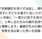 「妊婦健診を受けず出産し、顔も見ずに子どもを養子に出したが1ヶ月後に『一度だけ息子を見せて』と申し出た生みの親の気持ちを理解します」養親が生みの親の背景を汲み取った思いを投稿