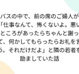 バスの中で、前の席のご婦人が「仕事なんて、怖くないよ。悪いところがあったらちゃんと謝って、何かしてもらったらお礼を言う。それだけだよ」と隣の若者を励ましていた話
