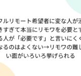 フルリモート希望者に変な人が湧きすぎて本当にリモワを必要とする人が「必要です」と言いにくくなるのはよくない→リモワの難しい面がいろいろ挙げられる