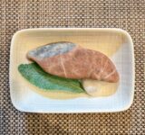昨日拾った石で一番のお気に入り…ただ皿に石を乗せただけなのに鮭の切り身感がすごい→色合いも形もそっくり「コンタクト入ってなかったら普通に鮭と認識しそう」