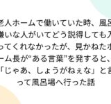 老人ホームで働いていた時、風呂嫌いな人がいてどう説得しても入ってくれなかったが、見かねたホーム長が“ある言葉”を発すると、「じゃあ、しょうがねぇな」と言って風呂場へ行った話