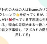 「社内の大体の人はTeamsのリアクションで👍を使ってくるが、1人だけ🦀使ってくる不思議な先輩いる」理由の考察始まる→皆さんの絵文字事情も「アボカドの愛多用してる」