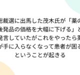 総裁選に出馬した茂木氏が「薬の後発品の価格を大幅に下げる」と発言していたがこれをやったら薬が手に入らなくなって患者が困るということが起きる