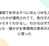 職場で氷作るやつにめんつゆを入れたのが運用されてて、色付きだからすぐわかるし、わかるはずだった…誰かがお客様用の麦茶の氷に使った