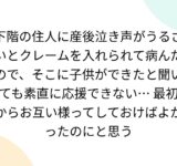 下階の住人に産後泣き声がうるさいとクレームを入れられて病んだので、そこに子供ができたと聞いても素直に応援できない… 最初からお互い様ってしておけばよかったのにと思う