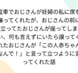 電車でおじさんが妊婦の私に席を譲ってくれたが、おじさんの前に立ってたおじさんが座ってしまい、何も言えずにいたら譲ってくれたおじさんが「この人赤ちゃんなんで!」と言って立つように言ってくれた話