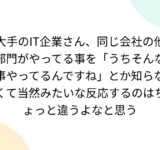 大手のIT企業さん、同じ会社の他部門がやってる事を「うちそんな事やってるんですね」とか知らなくて当然みたいな反応するのはちょっと違うよなと思う