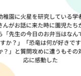 幼稚園に火星を研究している学者さんがお話に来た時に園児たちから「先生の今日のお弁当はなんですか?」「恐竜は何が好きですか?」と質問攻めに遭うもその対応に感動した