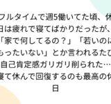 フルタイムで週5働いてた頃、休日は疲れで寝てばかりだったが、「家で何してるの?」「若いのにもったいない」とか言われるたび自己肯定感ガリガリ削られた… 寝て休んで回復するのも最高の休日