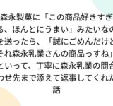 森永製菓に「この商品好きすぎる、ほんとにうまい」みたいなのを送ったら、「誠にごめんだけどそれ森永乳業さんの商品っすね」といって、丁寧に森永乳業の問合わせ先まで添えて返事してくれた話