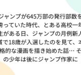 ジャンプが645万部の発行部数を誇っていた時代、とある高校一年生がある日、ジャンプの月例新人賞で18歳が入選したのを見て、本格的な漫画を描き始めた話… その少年は後にジャンプ作家に