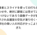 業者とスライドを使っての打ち合わせ中、絶対に顧客には見せてはいけないであろう画像データが表示され会議室の空気が凍り付く→弊社の偉い人の対応がかっこよすぎた