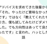 アドバイスを求めてきた後輩から「それ、やったけど意味なかったです」ではなく『教えてくれたやり方、僕も試してみたけどダメでした。でも方向性はあってて良かったです』と言われ、ハッとした話
