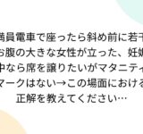満員電車で座ったら斜め前に若干お腹の大きな女性が立った、妊娠中なら席を譲りたいがマタニティマークはない→この場面における正解を教えてください…