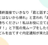 最終面接でいきなり「君と話すことはないから帰れ」と言われ「お待ちください!私はお役に立てます!」と下弦の鬼ムーブをしたらビルを出てすぐ内定通知が来た話