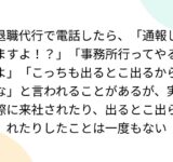 退職代行で電話したら、「通報しますよ!?」「事務所行ってやるよ」「こっちも出るとこ出るからな」と言われることがあるが、実際に来社されたり、出るとこ出られたりしたことは一度もない