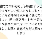 観てて辛いから、24時間テレビのマラソン企画はどうしてもやりたいなら時期は秋か春に変えてほしい… 熱中症アラートが出るような暑さの中で走っているのを観ると、心配する気持ちが上回ってしまう