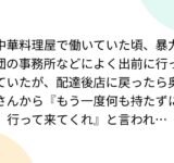 中華料理屋で働いていた頃、暴力団の事務所などによく出前に行っていたが、配達後店に戻ったら奥さんから『もう一度何も持たずに行って来てくれ』と言われ…