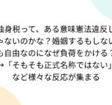 独身税って、ある意味憲法違反じゃないのかな?婚姻するもしないも自由なのになぜ負荷をかける?→「そもそも正式名称ではない」など様々な反応が集まる